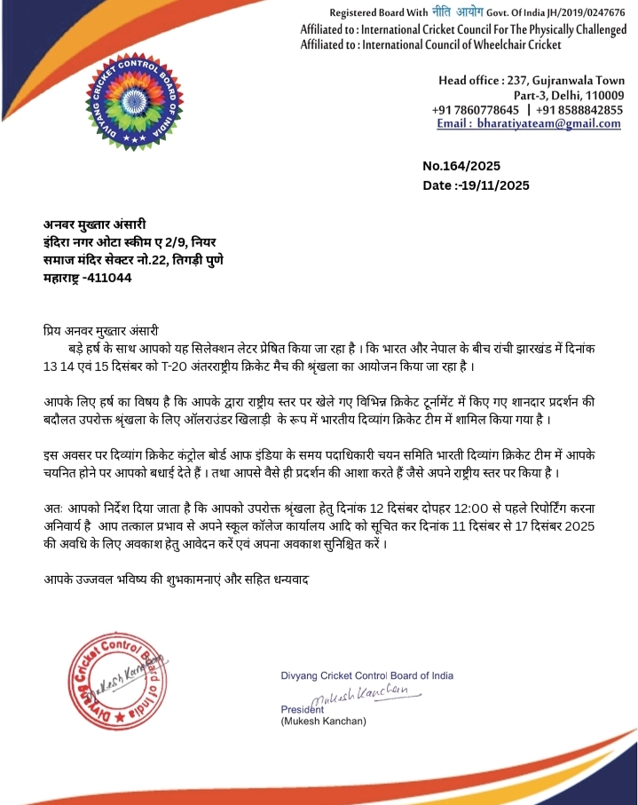 पिंपरी–चिंचवड, दि. 19 (युनूस खतीब) भारत सरकारच्या नीती आयोगावर नोंदणीकृत दिव्यांग क्रिकेट नियंत्रण मंडळ ऑफ इंडिया अंतर्गत खेळणाऱ्या भारतीय दिव्यांग क्रिकेट संघासाठी पिंपरी-चिंचवड येथील अन्वर मुख्तार अन्सारी यांची अष्टपैलू खेळाडू म्हणून निवड झाली आहे. त्यांच्या निवडीचे पत्र संघाचे पदाधिकारी मुकेश कांचन यांनी 19 नोव्हेंबर रोजी अधिकृतरित्या जाहीर केले.