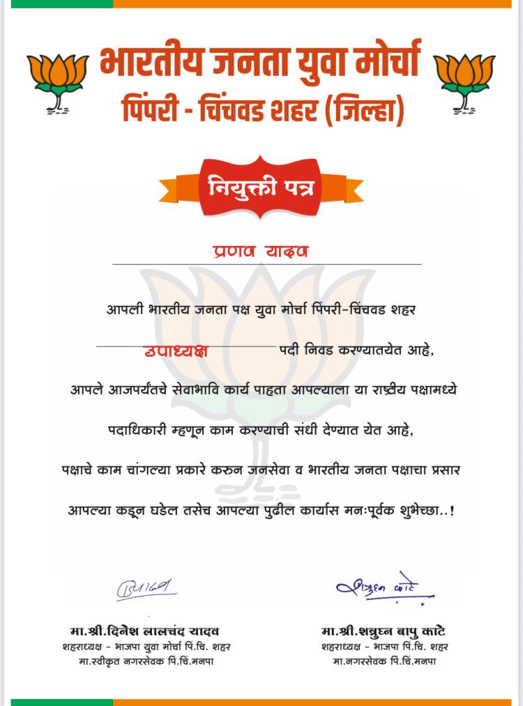 पिंपरी–चिंचवड दिनांक : ३० (pccnews.in) भारतीय जनता युवा मोर्चा पिंपरी–चिंचवड शहराच्या संघटनात्मक बांधणीसाठी करण्यात आलेल्या नव्या नियुक्त्यांमध्ये प्रणव प्रकाश यादव यांची शहर उपाध्यक्षपदी निवड करण्यात आली आहे. भाजयुमो शहराध्यक्ष मा. श्री. दिनेश लालचंद यादव आणि भाजपा पिंपरी–चिंचवड शहराध्यक्ष मा. श्री. शत्रुघ्न बापू काटे यांच्या हस्ते यादव यांना नियुक्तीपत्र प्रदान करण्यात आले.