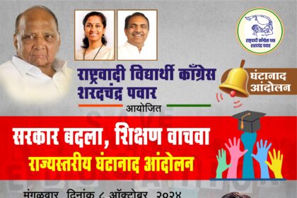 उद्या दिनांक 8 ऑक्टोंबर 2024 रोजी राज्यभर शरदचंद्र पवार राष्ट्रवादी विद्यार्थी काँग्रेसचे घंटानाद आंदोलन.
