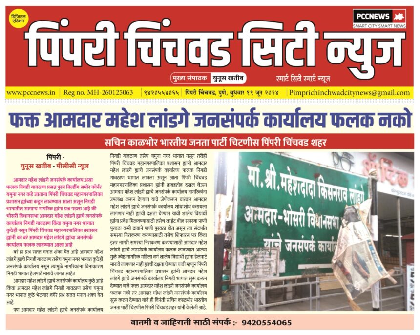 पण आमदार महेश लांडगे ह्याचे जनसंपर्क कार्यालय निगडी गावठाण तसेच यमुना नगर भागात नसून तरीही पिंपरी चिंचवड महानगरपालिका प्रशासन ह्यांनी आमदार महेश लांडगे ह्याचे जनसंपर्क कार्यालय फलक निगडी गावठाण भागात लावला असून आता पिंपरी चिंचवड महानगरपालिका प्रशासन ह्यांनी ताबडतोब दखल घेऊन आमदार महेश लांडगे ह्याचे जनसंपर्क कार्यालय नागरिकांना उपलब्ध करून देण्यात यावे जेणेकरून वारंवार आमदार महेश लांडगे ह्याचे जनसंपर्क कार्यालय शोधाशोध करायला लागणार नाही ह्याची दक्षता घेण्यात यावी शालेय विद्यार्थी ह्यांना प्रवेश मिळवण्यासाठी तसेच लाईट बील समस्या पाणी पुरवठा कमी दाबाने पाणी पुरवठा होत असून त्या संदर्भात समस्या निराकरण करण्यासाठी तसेच शिफारस पत्र किंवा इतर नागरी समस्या निराकरण करण्यासाठी आमदार महेश लांडगे ह्याचे जनसंपर्क कार्यालय फलक लावण्यात आल्या मुळे ज्येष्ठ नागरिक महिला वर्ग शालेय विद्यार्थी ह्यांना हेलपाटे मारावे लागणार नाही ह्याची दक्षता घेण्यात यावी म्हणून पिंपरी चिंचवड महानगरपालिका प्रशासन ह्यांनी आमदार महेश लांडगे ह्याचे जनसंपर्क कार्यालय निगडी भागात सुरू करुन देण्यात यावे फक्त आमदार महेश लांडगे जनसंपर्क कार्यालय फलक नको तर आमदार महेश लांडगे जनसंपर्क कार्यालय सुरू करुन देण्यात यावे ही विनंती सचिन काळभोर भारतीय जनता पार्टी चिटणीस पिंपरी चिंचवड शहर यांनी केलेली आहे.