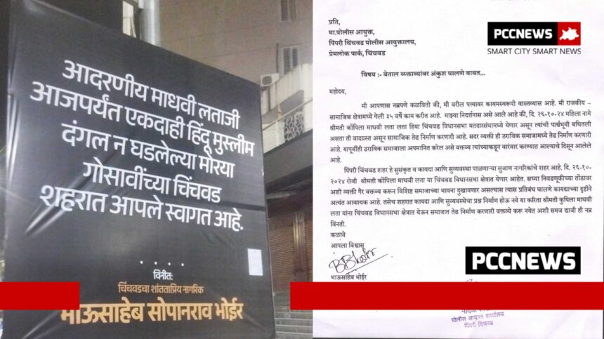 पिंपरी चिंचवड दिनांक: २६ ऑक्टोबर २०२४ (पीसीसी न्यूज प्रतिनिधी) महासाधू मोरया गोसावी, संत ज्ञानेश्वर माऊली आणि जगद्गुरु संत तुकाराम महाराज यांच्या विचारांचा आदर्श पिंपरी चिंचवड शहराला आहे. हे सुसंकृत व कायदा आणि सुव्यवस्था पाळणाऱ्या सुजाण नागरिकांचे शहर आहे. या शहरामध्ये देशभरातून येऊन सर्व जाती, धर्माचे लोक कष्ट करून देशाच्या आर्थिक व सामाजिक विकासात हातभार लावत आहेत. ज्येष्ठ नेत्या माधवी लता यांनी निवडणुकीच्या तोंडावर चिंचवड विधानसभा क्षेत्रात येऊन प्रक्षोभक वक्तव्य करू नये व सामाजिक वातावरण बिघडवू नये अशा आशयाचे पत्र ज्येष्ठ नेते भाऊसाहेब भोईर यांनी पोलीस आयुक्त यांना दिले आहे.