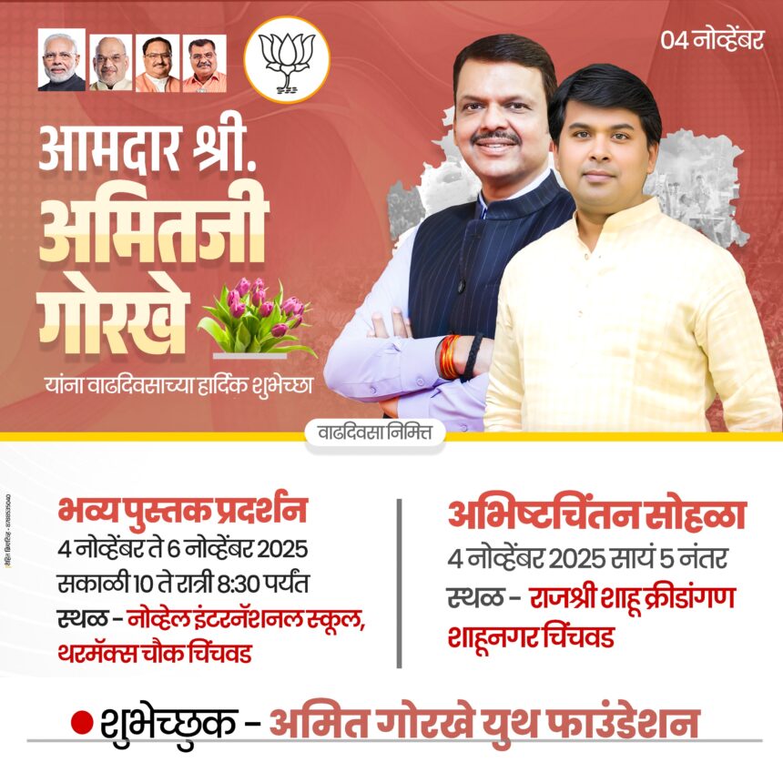 यासोबतच, आमदार अमित गोरखे यांचा अभीष्टचिंतन सोहळा ४ नोव्हेंबर रोजी सायंकाळी ५:०० वाजता राजर्षी शाहू क्रीडांगण येथे आयोजित करण्यात आला आहे. यानिमित्त अनेक मान्यवर उपस्थित राहणार असून, हा सोहळा नागरिकांसाठी विशेष आकर्षण ठरणार आहे.