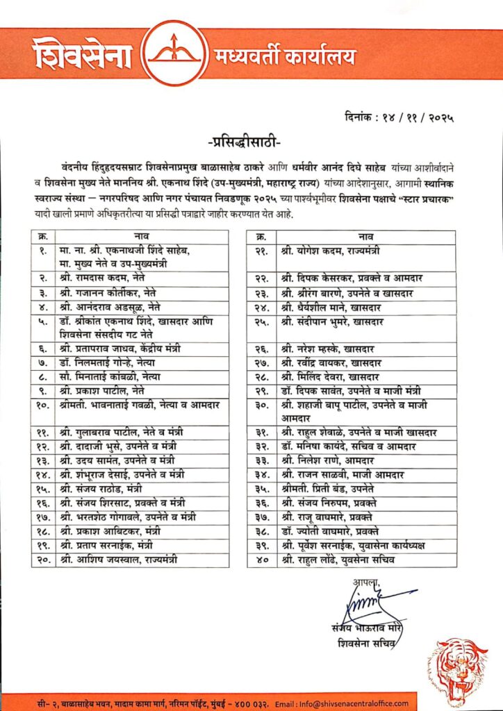 पिंपरी–चिंचवड, दिनांक: १५ वंदनीय हिंदुहृदयसम्राट शिवसेनाप्रमुख बाळासाहेब ठाकरे आणि धर्मवीर आनंद दिघे साहेब यांच्या आशीर्वादाने तसेच शिवसेना मुख्य नेते व उपमुख्यमंत्री मा. ना. श्री. एकनाथ शिंदे यांच्या आदेशानुसार आगामी स्थानिक स्वराज्य संस्था – नगरपरिषद व नगर पंचायत निवडणूक २०२५ च्या पार्श्वभूमीवर शिवसेना पक्षाची “स्टार प्रचारक” यादी जाहीर करण्यात आली आहे.
