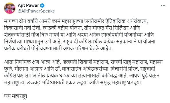 राष्ट्रवादी काँग्रेस पक्ष निवडणुकीसाठी पूर्णपणे तयार आहे, निवडणूक आयोगाने महाराष्ट्रातील विधानसभा निवडणुकीच्या तारखा जाहीर केल्यानंतर उपमुख्यमंत्री आणि राष्ट्रवादी काँग्रेसचे अध्यक्ष अजित पवार यांनी प्रतिक्रिया दिली, ते म्हणाले,“आमचा विकासकामांचा ट्रॅक रेकॉर्ड महाराष्ट्रातील लोकांच्या कल्याणासाठीच्या आमच्या बांधिलकीची साक्ष देतो. निवडणुकांच्या घोषणा होताच अजित पवारांनी ट्विट केले आहे.