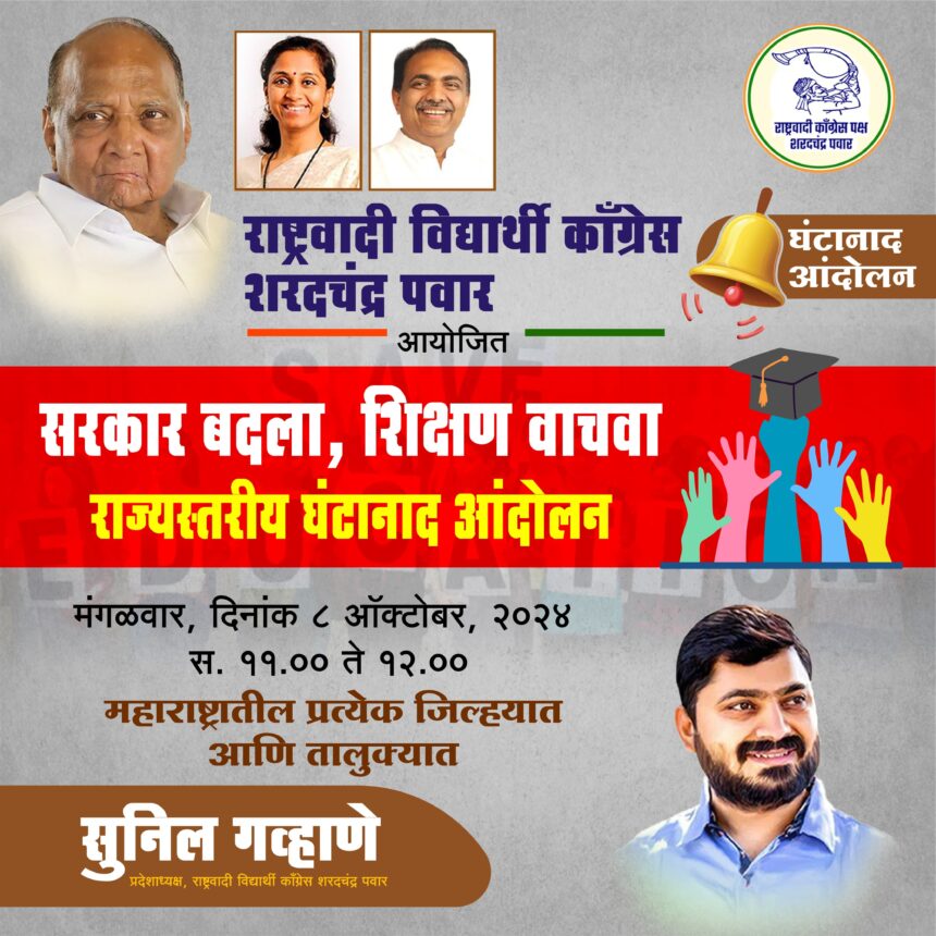 उद्या दिनांक 8 ऑक्टोंबर 2024 रोजी राज्यभर शरदचंद्र पवार राष्ट्रवादी विद्यार्थी काँग्रेसचे घंटानाद आंदोलन.