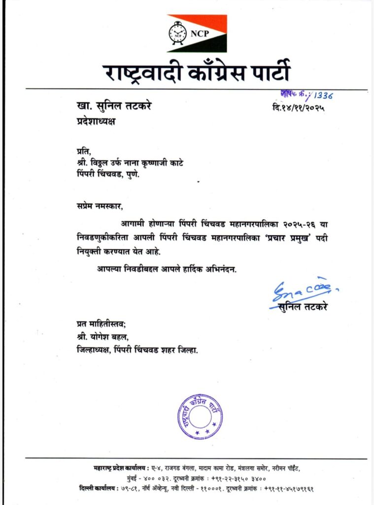 पिंपरी, दि. 14 (प्रतिनिधी) – पिंपरी-चिंचवड महानगरपालिका निवडणूक 2025-26 च्या पार्श्वभूमीवर राष्ट्रवादी काँग्रेस पक्षाने महत्त्वाचा निर्णय घेतला असून, पक्षाचे ज्येष्ठ नेते व माजी विरोधी पक्षनेते विठ्ठल उर्फ नाना काटे यांची शहराच्या प्रचार प्रमुखपदी नियुक्ती करण्यात आली आहे. उपमुख्यमंत्री अजितदादा पवार यांच्या मार्गदर्शनानुसार प्रदेशाध्यक्ष सुनील तटकरे यांनी यासंदर्भाचे अधिकृत पत्र आज (दि. 14) नाना काटे यांना सुपूर्द केले.