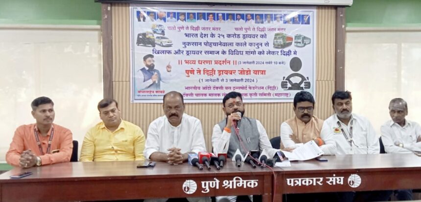 या मुळे देशातील सुमारे २५ कोटी चालकांचे भवितव्य धोक्यात आले आहे. हा काळा कायदा रद्द करावा आणि चालकांच्या इतर प्रलंबित मागण्या मान्य कराव्या यासाठी बुधवारी ३ जानेवारी पासून दिल्ली मध्ये जंतर मंतर येथे धरणे आंदोलन करण्यात येणार आहे. या आंदोलनात देशभरातील ७५० पेक्षा जास्त संघटनाचे प्रतिनिधी सहभागी होणार आहेत. पुणे, पिंपरी चिंचवड शहर आणि पुणे जिल्ह्यातून हजारो चालक दिल्लीमध्ये आंदोलनात सहभागी होणार आहेत अशी माहिती ऑटो, टॅक्सी, ट्रक, बस, चालक मालक फेडरेशनचे राष्ट्रीय अध्यक्ष बाबा कांबळे यांनी पत्रकार परिषदेत दिली.
