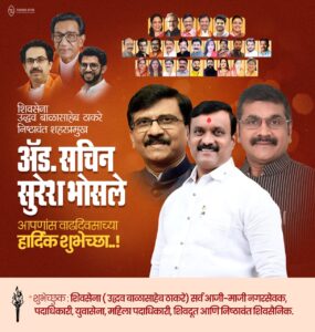 शिवसेना उद्धव बाळासाहेब ठाकरे पक्षाची पिंपरी चिंचवड शहराध्यक्ष सचिन भोसले यांचा 23 सप्टेंबर रोजी वाढदिवस आहे. त्यांच्या वाढदिवसानिमित्त मोरया गोसावी मंदिर, चिंचवड, शिवमंदिर येथे अभिषेक होणार आहे. आकुर्डी येथील खंडोबामाळ येथे हितचिंतक व कार्यकर्त्यांच्या शुभेच्छा स्वीकारण्यासाठी सकाळी 10 ते दुपारी 2 अशी वेळ निश्चित करण्यात आली आहे. त्याच ठिकाणी सायंकाळी ७ वाजल्यापासून सत्काराचा कार्यक्रम होणार आहे. यामध्ये शिवसेना उद्धव बाळासाहेब ठाकरे पक्षाचे जिल्हा संघटक प्रमुख सचिन अहिर, रवींद्र मिर्लेकर, संजोग वाघेरे, माजी आमदार गौतम चाबुकस्वार यांच्यासह अनेक मान्यवर उपस्थित राहणार आहेत.