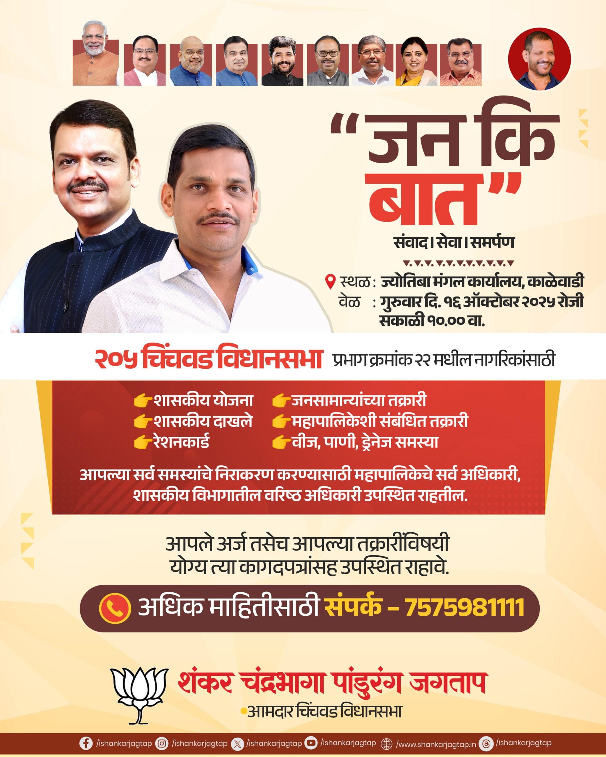 “जन की बात” – आमदार शंकर जगतापांचा थेट जनसंवाद आज! काळेवाडीमध्ये नागरिकांच्या तक्रारींवर होणार ऑन-द-स्पॉट तोडगा