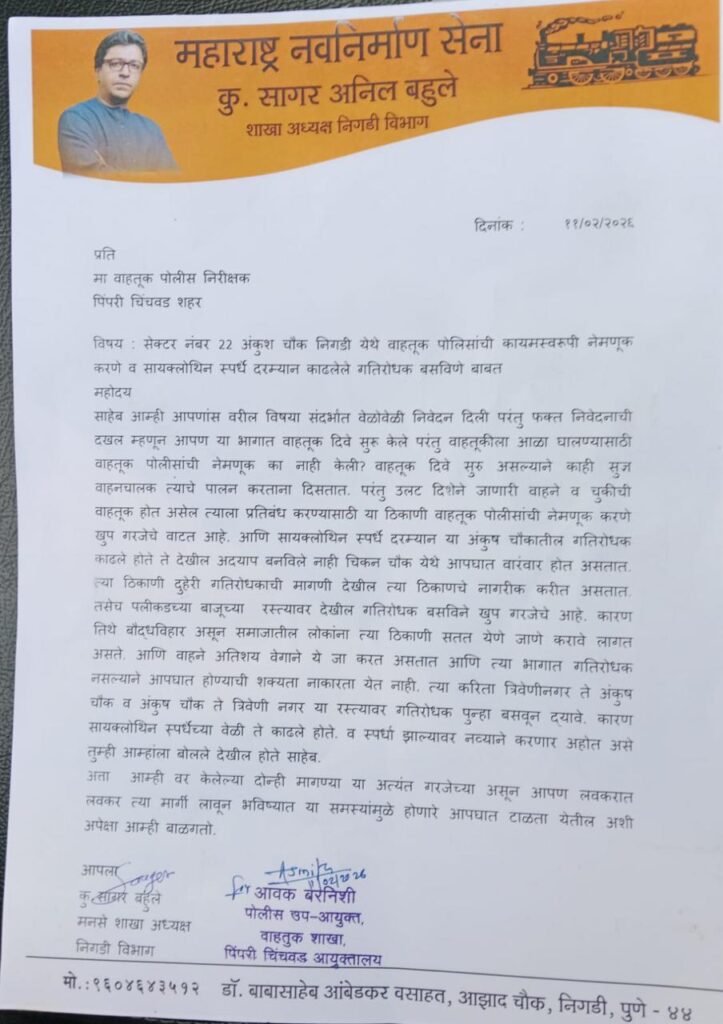 मनसेच्या निगडी विभाग शाखेचे अध्यक्ष कु. सागर अनिल बहुले यांनी यासंदर्भात पिंपरी-चिंचवड वाहतूक पोलिस निरीक्षकांना निवेदन दिले आहे. या निवेदनात नमूद करण्यात आले आहे की, अंकुश चौक व त्यालगतच्या रस्त्यांवर सातत्याने वाहतूक नियमांचे उल्लंघन होत असून विशेषतः सायकलथॉन व इतर स्पर्धांच्या वेळी मोठ्या प्रमाणावर वाहतूक विस्कळीत होते. वेगवान वाहने, दुचाकींची बेदरकार चाल आणि गतिरोधकांचा अभाव यामुळे अपघाताचा धोका वाढला आहे.