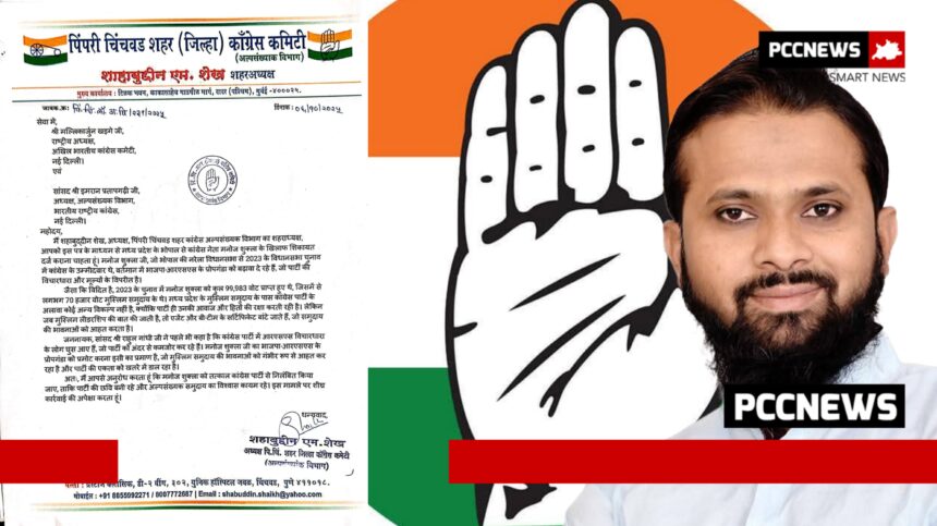 पिंपरी चिंचवड शहर काँग्रेस अल्पसंख्यक विभागाचे अध्यक्ष शहाबुद्दीन शेख यांचे काँग्रेस उच्च नेतृत्वाला पत्र.