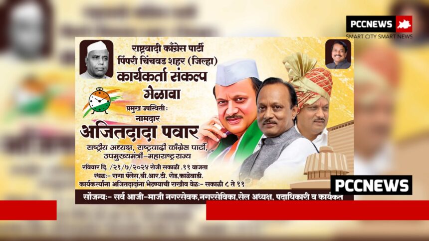 पिंपरी चिंचवड दिनांक १९ जुलै २०२४ (पीसीसी न्यूज प्रतिनिधी) राष्ट्रवादी काँग्रेस पक्ष, पिंपरी चिंचवड शहर (जिल्हा) “कार्यकर्ता संकल्प मेळावा” रविवार दिनांक २१ जुलै २०२४ रोजी राष्ट्रवादी काँग्रेस पक्षाचे राष्ट्रीय अध्यक्ष तथा उपमुख्यमंत्री अजितदादा पवार यांच्या प्रमुख उपस्थितीत आयोजित करण्यात आलेला आहे.